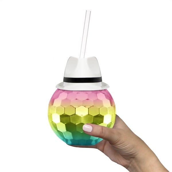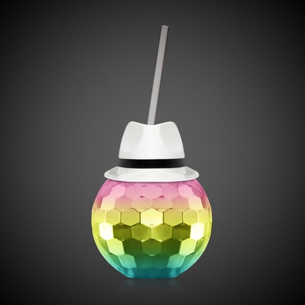 - Striking combination of a White Fedora Hat and Rainbow Disco Ball Cup.