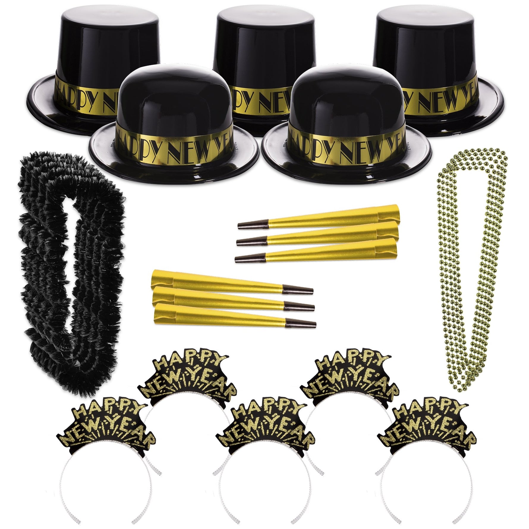 Elevate your New Year's Eve celebration with our spectacular Gold Showboat New Year Party Kit for 100, exclusively tailored to transform your event into an unforgettable experience. Designed to accommodate up to 100 guests, this luxurious Showboat New Year's Eve Party Kit offers a dazzling selection of festive party supplies, ensuring your countdown is as glamorous as it is memorable. Featuring premium-quality derbies for all attendees, along with an array of party accessories, this kit is your one-stop solution for ringing in the new year with style and panache. Whether you're hosting a grand gala or an intimate gathering, the Happy New Year celebration will shine brightly with every item thoughtfully curated to enhance the festivities.